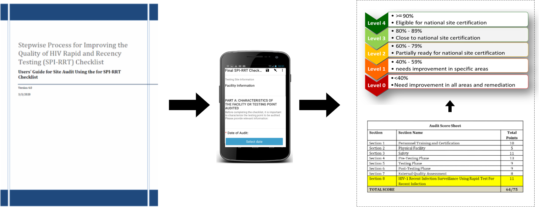 To assist ministries of health and national programs, a Stepwise Process for Improving the Quality of HIV Rapid and Recency Testing (SPI-RRT) checklist has been developed. The checklist provides guidance on quality assurance (QA) practices for sites using HIV rapid tests to diagnose HIV infection and for sites using the rapid test for recent infection (RTRI) for HIV-1 recent infection surveillance. The SPI-RRT checklist sets minimum standards for all HIV RT/RTRI testing points and provides guidelines for continuous quality improvement (CQI).